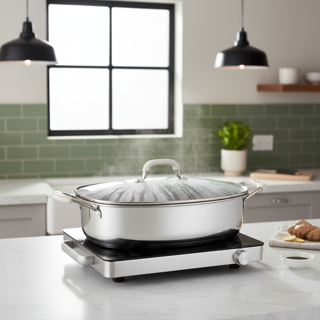 The widened oval structure provides ample internal space for large dishes and containers. Its extended shape solves the limitations of traditional round cookware, allowing efficient use of space and better heat distribution during steaming and cooking.